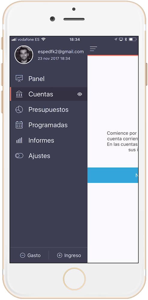 - Revisar las diferentes cuentas que hayamos incluido, añadiendo Gastos (incluso podremos añadir una fotografía de las facturas), Ingresos o Transferencias.