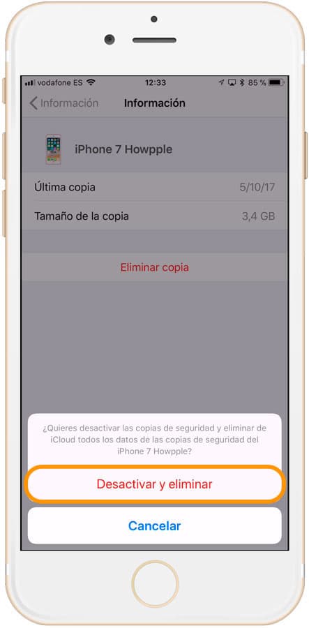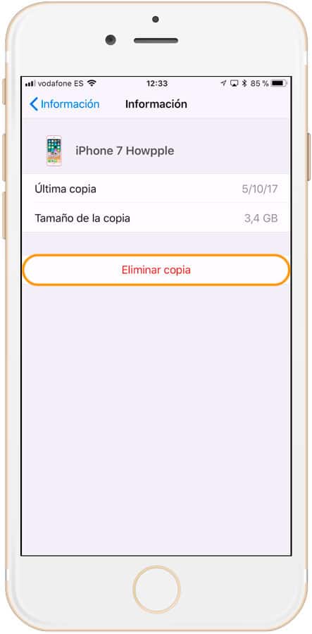 - Para eliminar una copia de seguridad, bastará con seleccionarla y pulsar en eliminar. Al hacerlo y de manera inmediata recuperaremos TODO el espacio que ocupaba en nuestra nube y que podremos comprobar en la pestaña principal de iCloud.