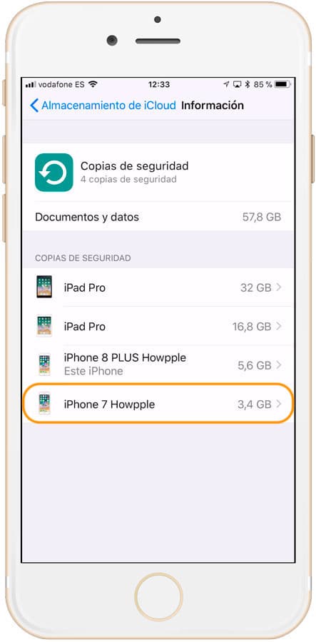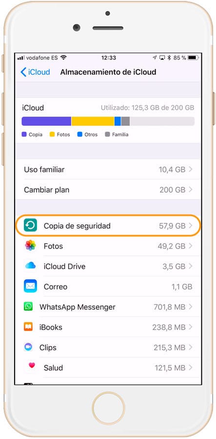 - Dentro de esta sección buscamos y entramos en «Copia de seguridad», donde veremos TODAS las copias de seguridad que tenemos en iCloud, la última fecha de realización y sobre todo el espacio que ocupan.