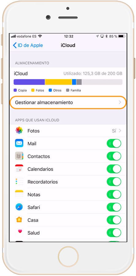 - Una vez dentro de las diferentes opciones pulsamos sobre iCloud > Gestionar almacenamiento. (Para acceder a esta sección es necesario contar con una conexión a internet, ya se Wi-Fi o por 4G).