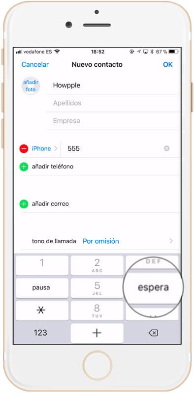 - Al presionarlo, el teclado cambia y nos da dos opciones nuevas «Pausa y Espera», es esta segunda tecla (Espera) la que necesitaremos pulsar para añadir el numero de extensión.