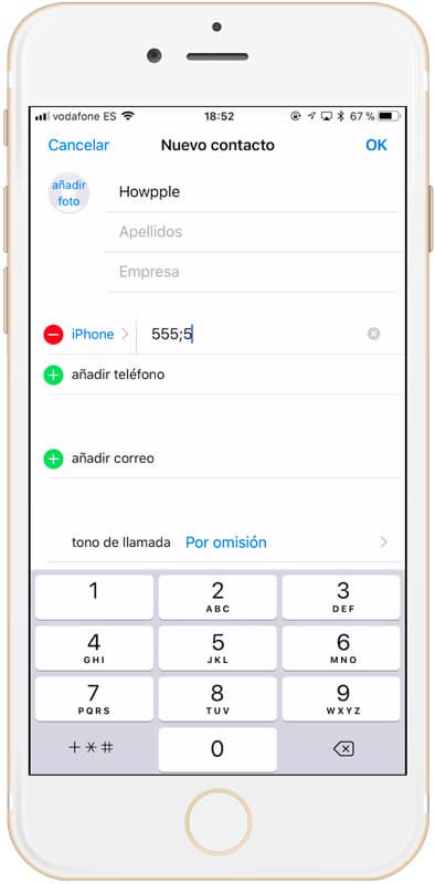 - Si tras añadir el número de teléfono lo pulsamos, nos añadirá a nuestro numero de teléfono un punto y coma, después del cual tendremos que añadir el número de extension que necesitemos.