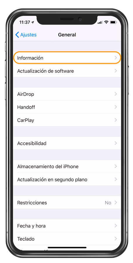 - Una vez ahí vamos a la sección General > información, donde encontraremos TODOS los datos importantes de nuestro equipo, tales como versión de software, capacidad de memoria, número de serie, aplicaciones instaladas y muchas cosas más.